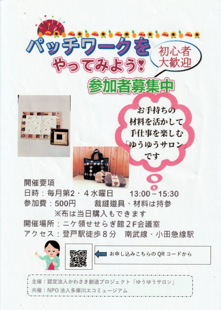 「ゆうゆうサロン」は手持ちの材料を活かしたパッチワークなどエコ手芸を楽しむ場です。エコに配慮した手仕事に興味のある方、おいでになりませんか。