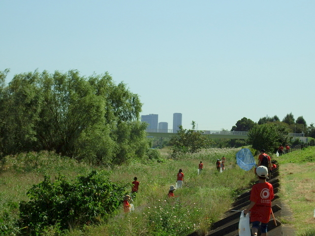 | (株)ディーアンドエムホールディングスの社員の方々、ご家族、スタッフ総勢50名の皆さんが、二ヶ領せせらぎ館周辺の多摩川河川敷の清掃に汗を流してくれました。 |
