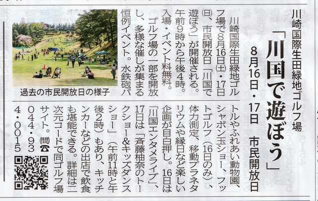 | 2025年8月1日 | 川国で遊ぼう 8月16日,17日 市民開放日 川崎国際生田緑地ゴルフ場 (タウンニュース 多摩区・麻生区版) |