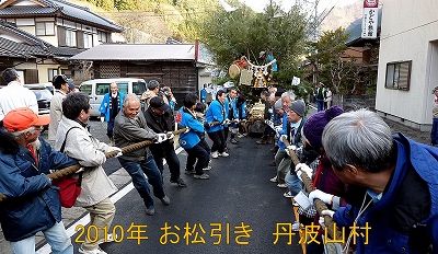 | お松引きは、1年間の無病息災や家内安全、五穀豊穣などを願った丹波山村に古くから 伝わる門松をはらう松送りの祭事。 ここには古代から運搬具として使われたY型の丸太をソリ状にした修羅(しゅら)と呼ばれる 台に、正月飾りの松や竹を乗せたものを引く。 丹波地区の修羅は内部に囃子座が設けられ、正面にその年の干支の飾り物をつける。 午後、村人たちが集まり、木遣りの合図で素朴な笛太鼓の囃子とともにソリが威勢よく 引かれる。 青梅街道沿いの熊野神社前を出発し、途中みかんや酒が大量に振る舞われる中、 道祖神場まで500mほどの距離を夕刻までかかって進む。 村はずれの道祖神場に着くと解体され、14日に無病息災を祈って焼かれ丹波山の正月が終わる。 |