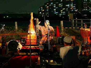 夕方にはグーンと涼しくなり、そよ風で心地よい多摩川、川辺のコンサートはシャボン玉と民族樂器は上手く調和