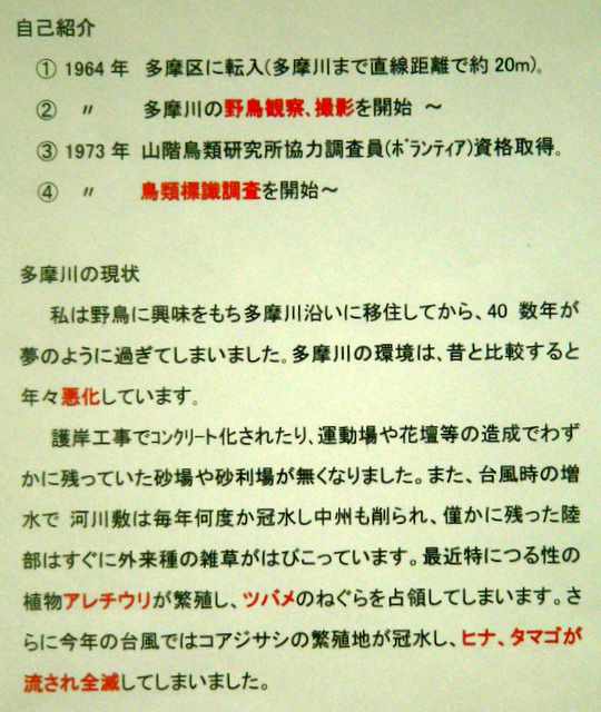 野鳥に興味を持ち多摩川沿線に移住して40年間の野鳥生息写真の展示です