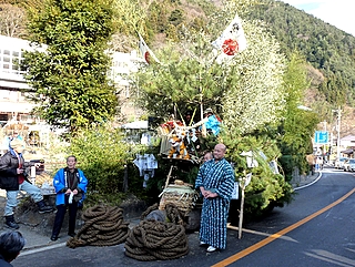 | 木遣りの合図で素朴な笛太鼓の囃子とともにソリが威勢よく引かれる。青梅街道沿 いの熊野神社前を出発し、道祖神場まで500mほどの距離を夕刻までかかって進む。 車が来たら止り、お酒やみかんの大盤振舞い・・・・歴史と田舎らしい情緒がたっぷり! |