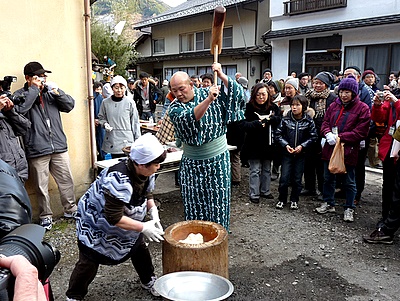 | 途中、餅つきで多摩川エコミュージアムの皆さんは大盛り上がりです | |