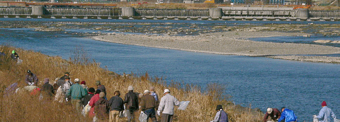 | 市民提案型協働事業に選ばれた多摩川の環境保全を推薦するための次世代育成事業 目的と狙い 多摩川の清掃活動」を近隣の老人会や区内3大学の学生、地域住民、市民活動団体が 一体となって実施し、環境保全の次世代への継承ネットワーク作りが目的とする。さらに 災害炊き出しの実戦など、防災のシメュレーションや危機管理アドバイザー等による講演 会を実施し、広域避難所としての多摩川の機能と役割についても検証する 呼びかけに、集まった300余名の若者と老人、冬至の青空の多摩川水辺の向かって元気 にはばたく、光景が始まる・・・・ |