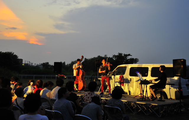 | 〜愛する人に捧げるMelody アコーステックPOPインストユニット style-3!を楽しんで〜 真夏の夕刻、恒例となった「第11回多摩川夕涼みコンサート」が 開催されました。 このコンサートは、日頃多摩川に親しんでいる地元の皆さんは もちろんのこと、市内外の流域の皆さんにも音楽を通じて多摩川の 魅力を発見してもらいたいという目的で始めました。 年々、聴衆が増えてきて皆が楽しむイベントとなっています。 |