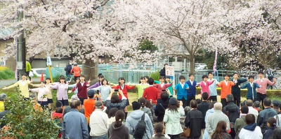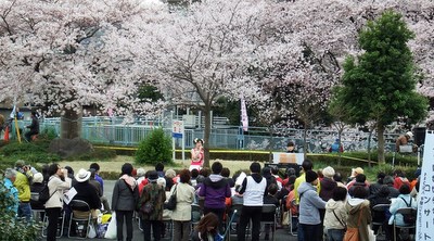 | お天気が気になる中、二ケ領用水の桜の脇で 恒例の桜のコンサートを開催しました。 約1,000名の方々が来場されました。 |