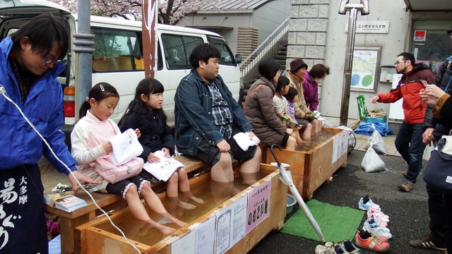 | せせらぎ館前の足湯サービスが大賑わいでした | |