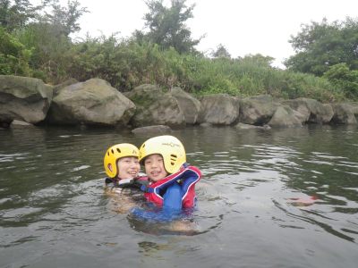 | 天気が今一で肌寒く感じる中、子ども達は川流れを楽しん でいました。川流れが終った子ども達は、軽自動車に乗り スタート地点まで戻りました。これも楽しかったそうです。 |