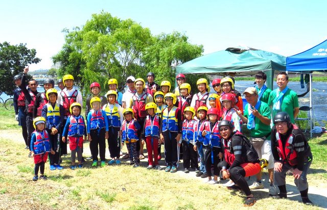 | 救護を担当された「川崎体育救護クラブ」の皆さん、「レスキュー3ジャパン」の高度な安全講習を受講した方々が、“河童の川流れ体験”を見守り、安全に無事に終えることが出来ました。ありがとうございました。 |