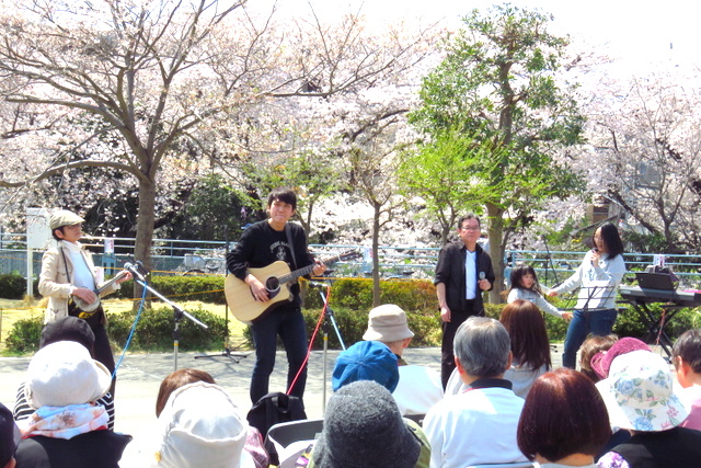 | 好天に恵まれ二ヶ領せせらぎ館前広場で 恒例の「桜のコンサート」を開催しました。 大勢の方が来場され楽しまれていました。 |