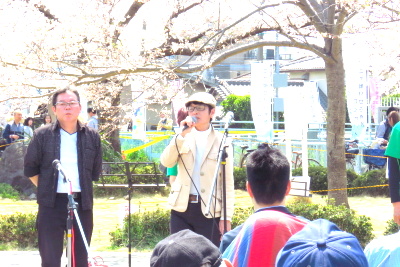| 曲名は、「サウンド・オブ・ミュージック」、「さくらさくら」、「春の小川」、 「春が来た」、「チキチキバンバン」、「チムチムチェリー」、「こどもの世界」、 「カントリーロード」、「タイム トゥ セイ グッバイ(君と旅立とう)」を咲きほこる 桜の下で熱唱されました。 アンコールに応えて「ふるさと」も歌われました。 |