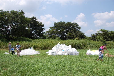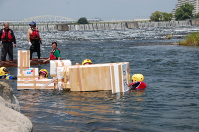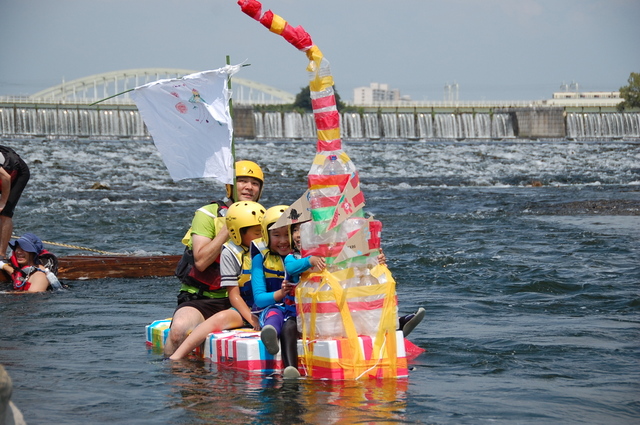 | 好天気で暑く水に浸かるのが心地よい多摩川の本コースですが、先日来の雨の影響により水嵩・水量とも多く、一部流れの早いところもありました。いかだ下りの乗船者は操船に苦労しておりました。今年は、19チーム、84名の方が参加・乗船されました。 各チーム共に例年に増して廃材活用、軽量化に努めたためかスタート直後に沈みかけたり分解したりする艇も見られましたが、工夫を凝らしたことで全艇がゴールしました。 以前から実施している大会趣旨の「いかだの解体とごみ分別」は、いかだ下りを終え疲れているのにも関わらず解体作業を、出艇者や応援者の協力を得て解体することができ、ごみの分別も完了しました。分別ゴミは、当日、多摩生活環境事業所のごみ回収車に引き渡しました。 この「いかだ下り」も、年々洪水の影響などで多摩川の流れが変わってきており、コースの見直しも必要になってきています。また、今年は、終了後の疲れや連日の暑さの中での作業ともあってかゴミ分別のレベルが、以前より乱雑・放漫気味になっております。次回に向けて、改善を促していきたいと考えています。ご協力の程お願いします。 |