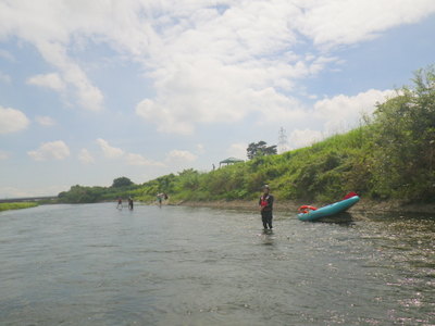 | 先の雨の影響により水嵩・水量とも多く、一部流れの早いところもあり、まさにラフティングボートで多摩川を下るにはうってつけの環境でした。 |