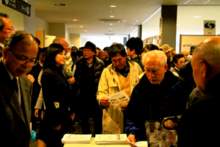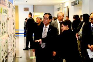 | 早々の受付も盛り上がりました | 実行委員会の作品を楽しく閲覧する阿部市長 |