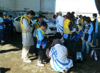 | ライフジャケットを着る応援団・始めて着る人もいた |