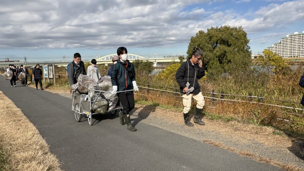 水草班では、多摩川の岸側に流れ着いた外来の水草を回収しました。