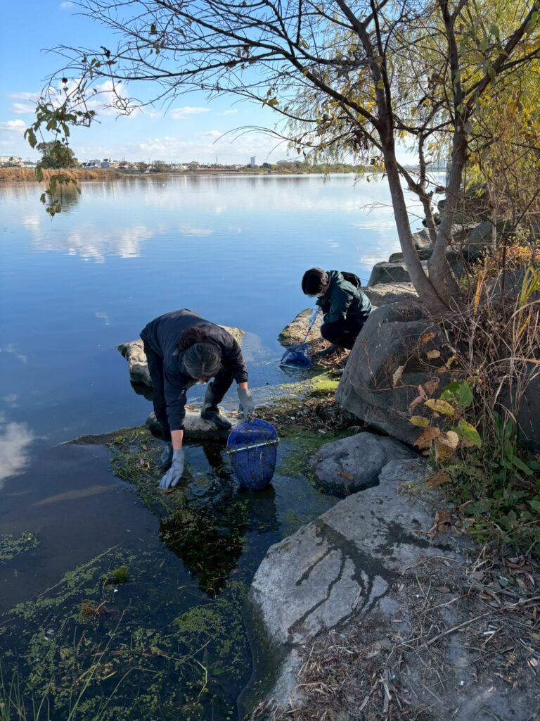 多摩川本流側になるので足場に気をつけながら網ですくったり手で抜いたりします。