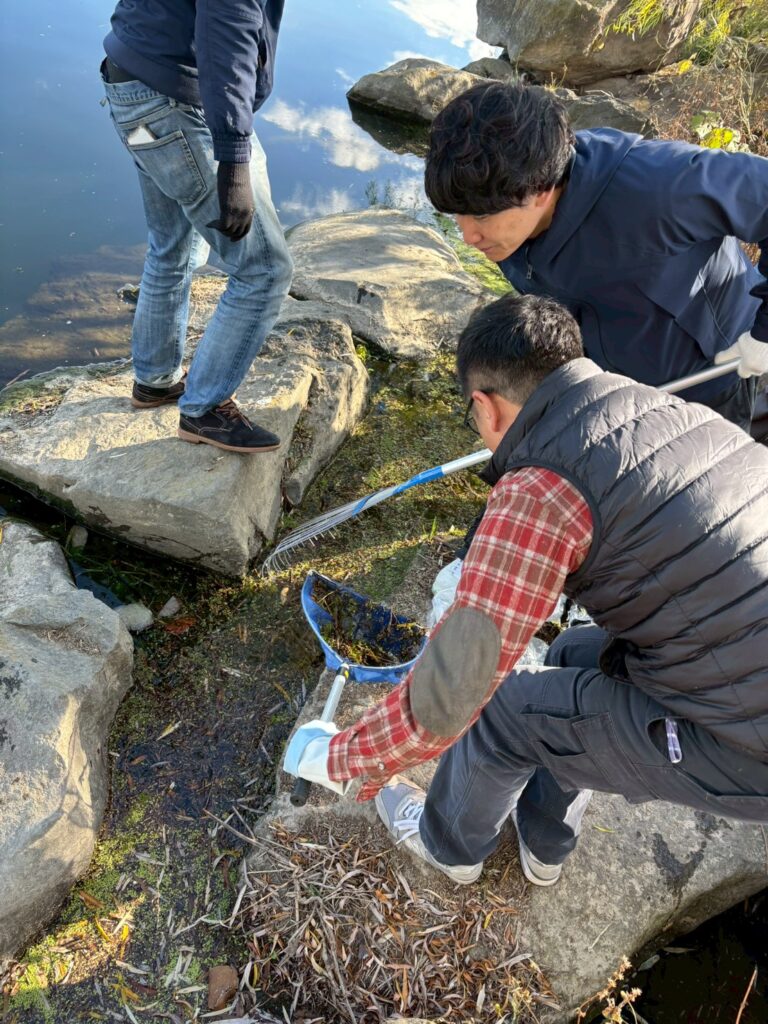 タモ網で掬っては混ざり合う在来水草と選別して袋詰めする、地道で大変な作業ですが、作業後には在来の水草が顔を覗かせるので達成感があります。