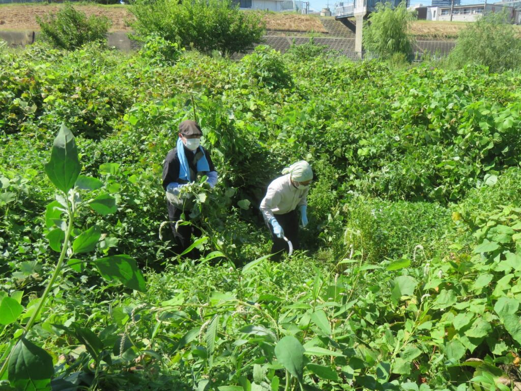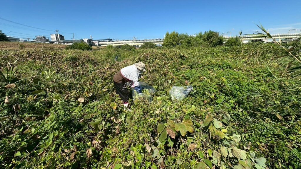 先月まで見られたオオフサモ(特定外来生物)やアマゾントチカガミ(重点対策外来種)は見当たりませんでした。2024年はアレチウリ、オオフサモ、ホテイアオイ、アイオオアカウキクサ、オオカワヂシャなど、防除対象の外来植物が多く自生していましたが、毎月の活動によりその数を大幅に減らすことができました。