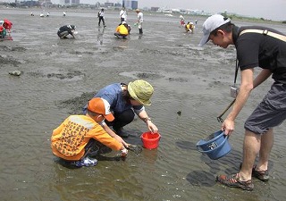 | 目的:河口干潟は川崎を流れる多摩川の終点、東京湾への入り口であり、貴重なG(マルハチ)空間=生態系保持空間です。そこで生息する生き物たちは川を浄化する貴重な生き物たちです。そして干潟そのものが海や川を綺麗にし、魚介たちの産卵の場としてまた、稚魚達の快適な生活の場として機能しています。多摩川の、川崎の大切な場所である河口干潟をこれからも大切にしていきたいとの目的からこの事業を実施しました。 |