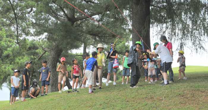 | 夏休みの7月28日・川崎市生田緑地ゴルフに市民開放の日に、かわさき水辺 の楽校が陸に上がったイベントに参加。 みどりの上で、ソリ遊びやターザンロープ遊びそして魚つかみ遊びを楽しんだ。 草ソリとターザンロープ遊びは、水と違った環境で子供達は5時間休みなしの盛況 でした。魚つかみではプールを3基用意したが人数が多すぎて大混乱! |