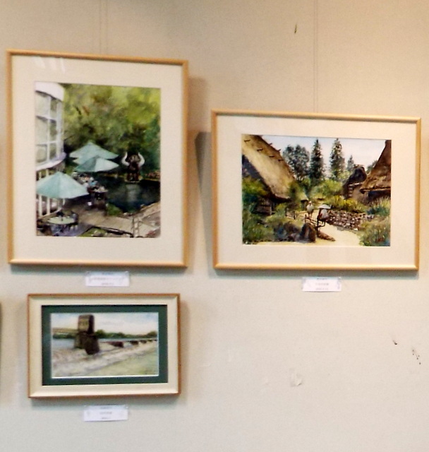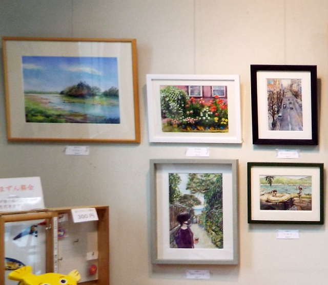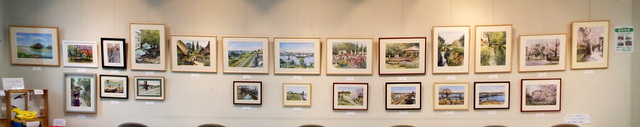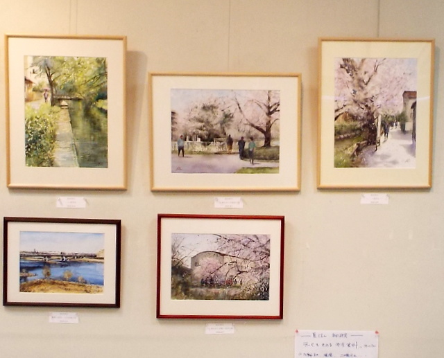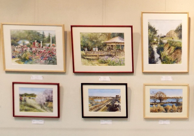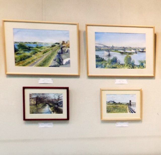 ニヶ領せせらぎ館・風景画教室講師の高田 伸生さんと受講者さんが、多摩川、生田緑地周辺の特徴的な景色を描いた風景画を展示しました。