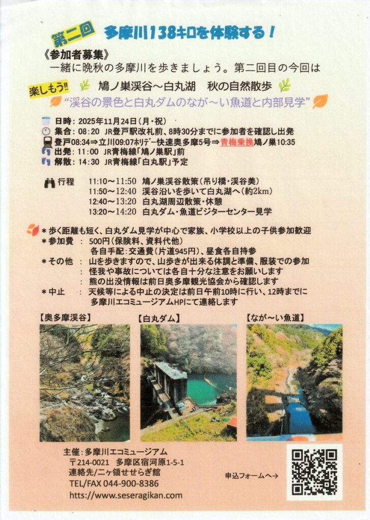 二ヶ領せせらぎ館を運営しています”NPO法人多摩川エコミュージアム”では、多摩川を河口から源流まで体験するツアーを実施しています。一緒に晩秋の多摩川を歩きましょう。