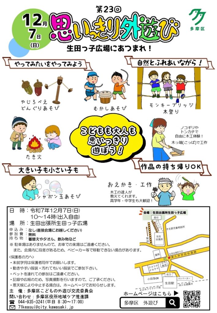 12/7(日)、かわさき水辺の楽校も参加している“多摩区こどもの外遊び交流委員会”主催の、“思いっきり外遊び”のご案内です。今回は生田出張所新広場(名前が決まって”生田っこ広場”)での開催です。