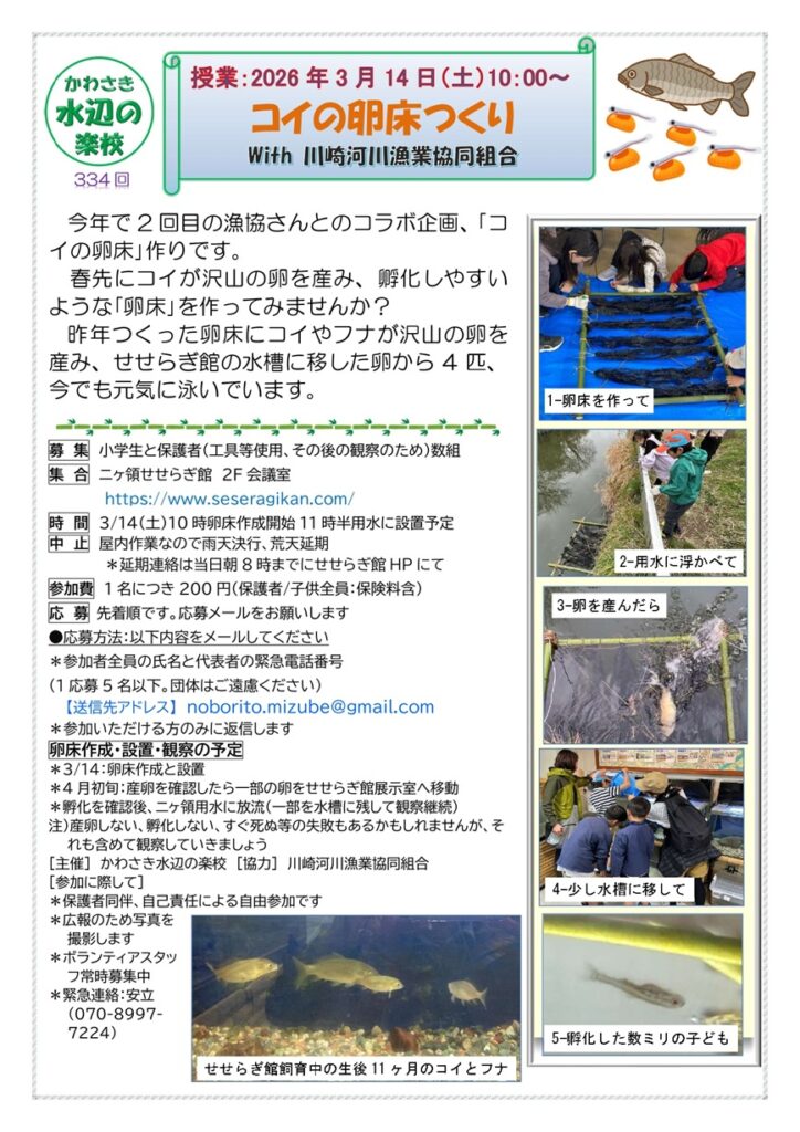 春先にコイが沢山の卵を産み、孵化しやすいような「卵床」を作ってみませんか?